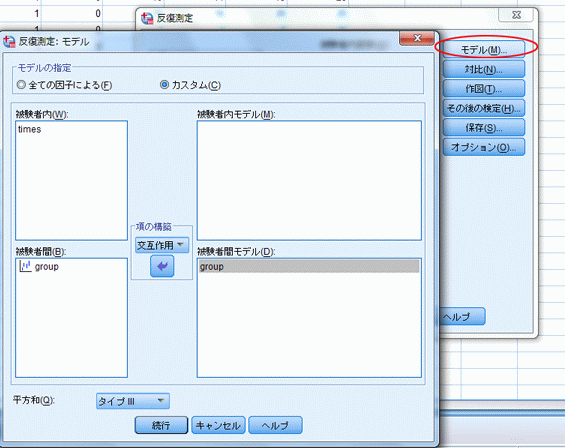 [モデル]ボタンをクリックし,モデルの指定を「カスタム」にして,計算対象となる要因を「項の構築」欄の矢印で右側に移す