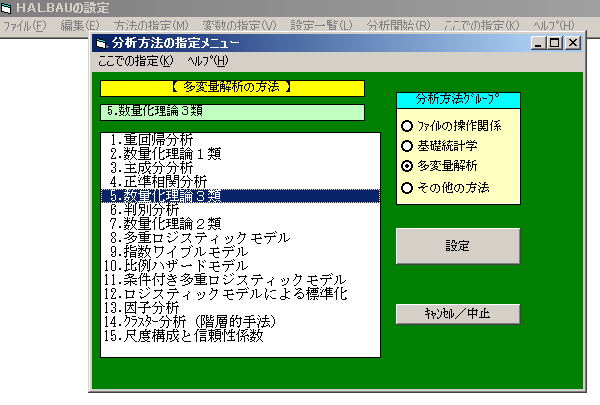 右側の「分析方法グループ」で「多変量解析」を選び左の一覧の中の「5.数量化理論3類」を選ぶ