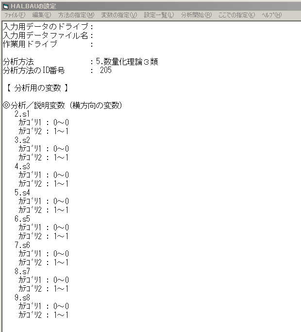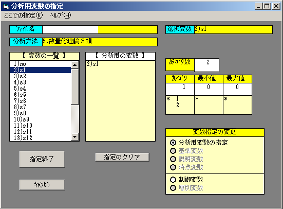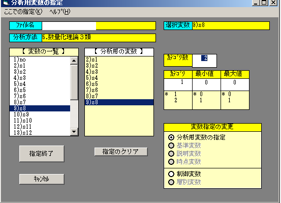 「変数の一覧」から分析する変数を右の「分析用の変数」に移し,カテゴリ数,カテゴリ値を設定する