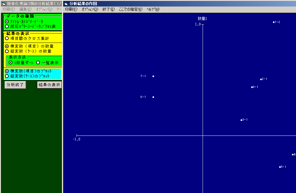 項目についての数量化結果(因子分析でいう項目の因子負荷量)を見るときは「横変数(項目)の数量」を指定し[結果の表示]