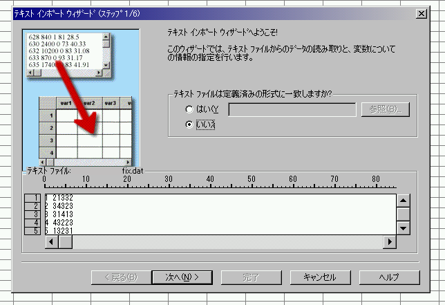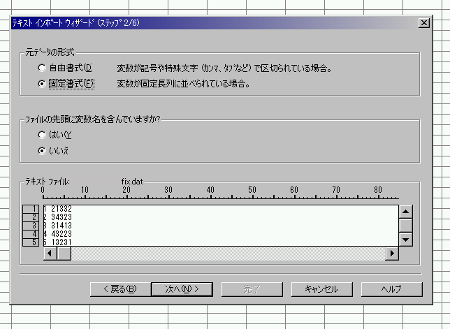 ファイルの先頭に変数名を含んでいますか?=通常は「いいえ」(先頭行が変数名の場合は「はい」)