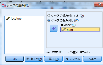 ※ケースの重み付け設定は,計算修了後も有効なままなので,別の計算をする際には,必ず設定解除(重み付けなし)に戻しておくこと。また検定する変数(度数の部分)を変更する場合も,ふたたび「ケース重み付け」をやりなおす。