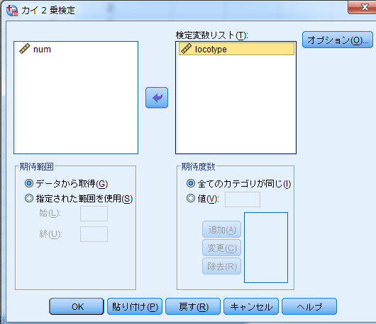 - 「ケースの重み付け」に検定したい度数を設定して[OK]